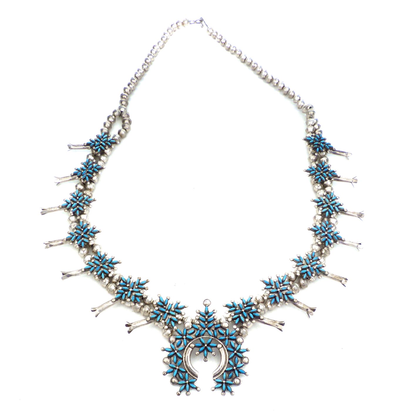 Source: shiprock-new.virtualgallerist.com Zuni petti point or petit point squash blossom necklaces have been a major part of the zuni native american indian's ceremonial wardrobe for many, many years. We are dedicated to providing extraordinary products and customer service. 1970's rare navajo pawn bisbee aqua turquoise squash blossom necklace $18,500.00.